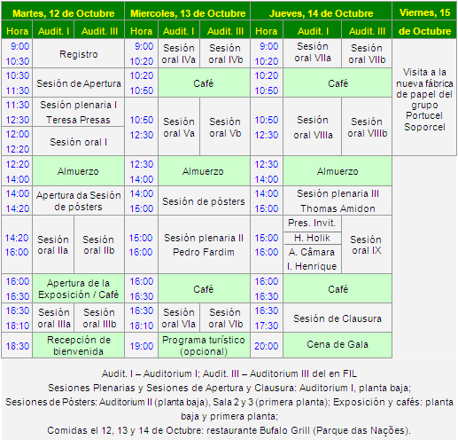 El Programa general preliminar incluye una ceremonia de apertura, 3 conferencias plenarias invitadas, 2 presentaciones invitadas (keynote lectures), presentaciones orales y sesiones de posters, y una ceremonia de cierre. Las presentaciones orales serán divididas en dos sesiones paralelas. El programa incluye una visita a una de las más grandes y más modernas fábricas del mundo de papel de impresión y escritura - una nueva fábrica de papel del grupo Portucel Soporcel, en Setúbal. Se ofrecerá a los participantes una recepción de bienvenida y una cena de gala, en un ambiente relajado y más propicio para discusiones informales y agradables momentos.