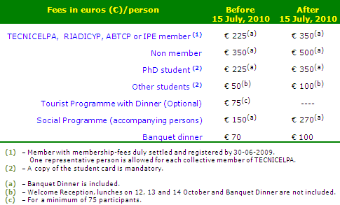 Fee for Conference participants/delegates includes Admission to the Scientific sessions and Exhibition, Conference documents/materials, Book of abstracts, Conference CD, Certificate of attendance, Welcome Reception (12 October), Lunches (12, 13 and 14 October), Coffee breaks, Banquet dinner (14 October) and the visit to Setúbal mill (15 October).